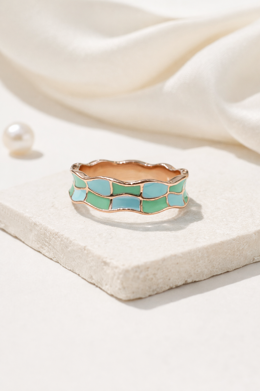 A modern enamel band designed with fluid, tile-like segments in soft aqua and mint tones. Framed in polished sterling silver, this ring brings effortless colour to everyday styling while keeping the silhouette refined and wearable.