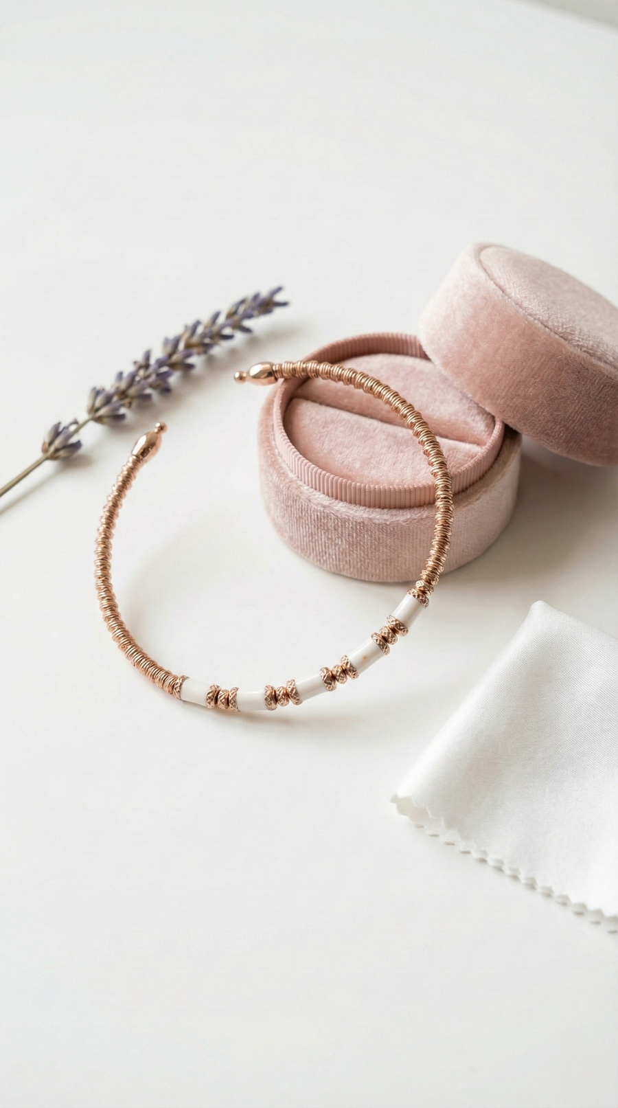 A delicate sterling silver bracelet crafted with fine rose-gold coils and softly spaced ivory-toned beads. Lightweight and fluid, the design wraps the wrist with an effortless, hand-finished elegance that feels personal and timeless.