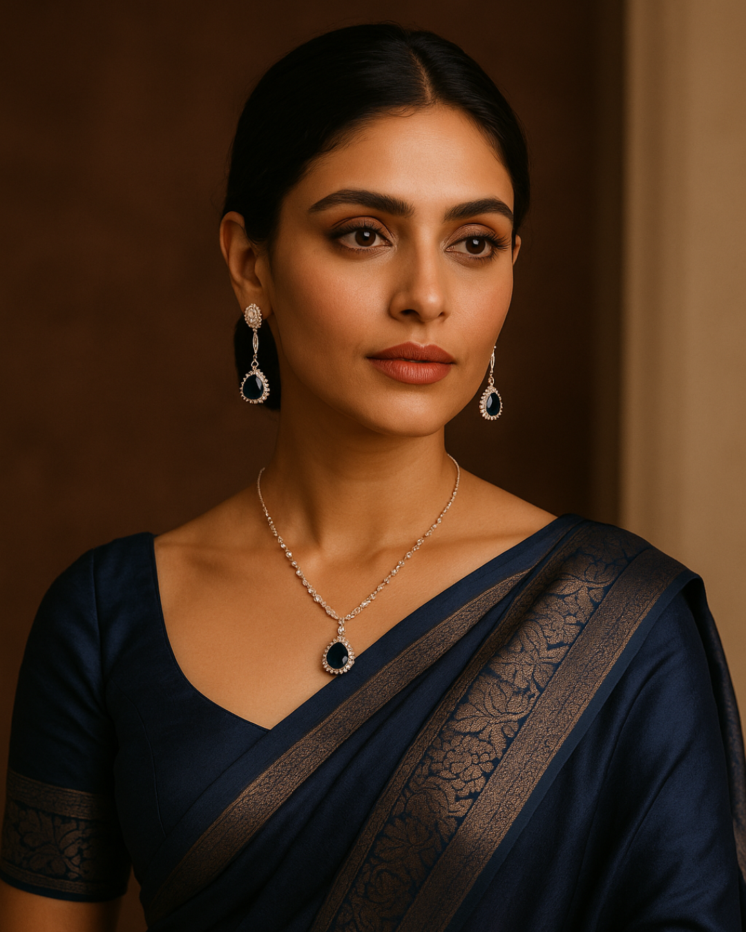 Where timeless sophistication meets modern allure. These earrings feature deep sapphire-toned teardrops framed by halos of sparkling cubic zirconia, suspended from oval-cut studs for an effortlessly regal silhouette. Handcrafted in certified 925 sterling silver and finished with a soft rose-gold sheen, they embody the quiet luxury of evening elegance.
