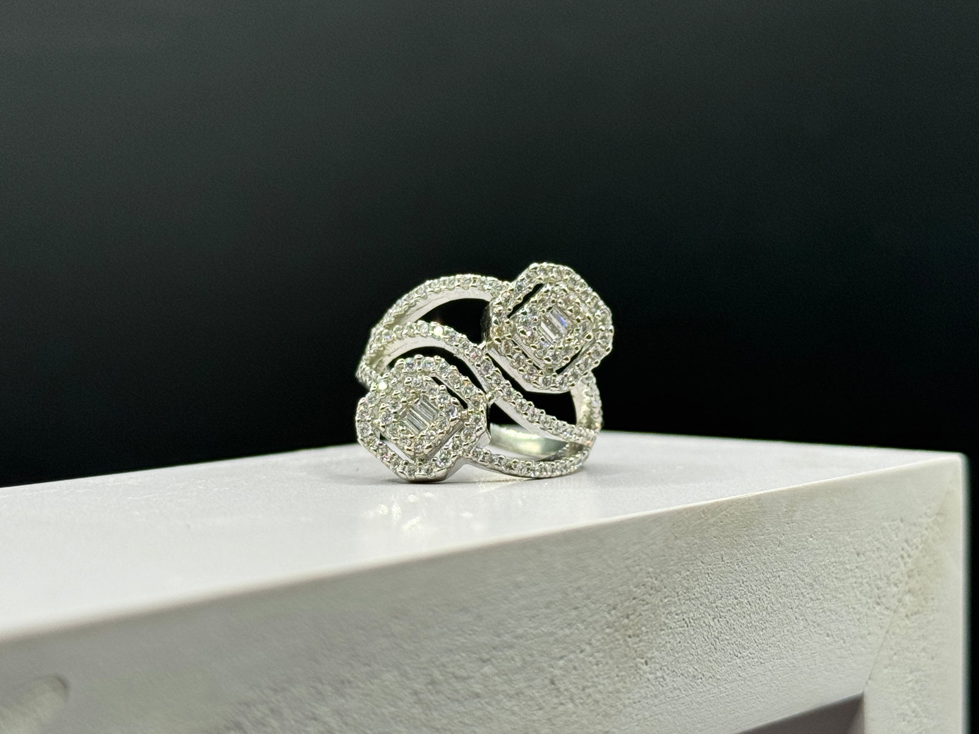 Make a grand statement with this exquisite ring featuring two prominent square clusters of brilliant baguette and round cut cubic zirconia stones. Set amidst gracefully flowing silver bands adorned with pave set stones, this design exudes opulence and intricate craftsmanship sure to turn heads.ย