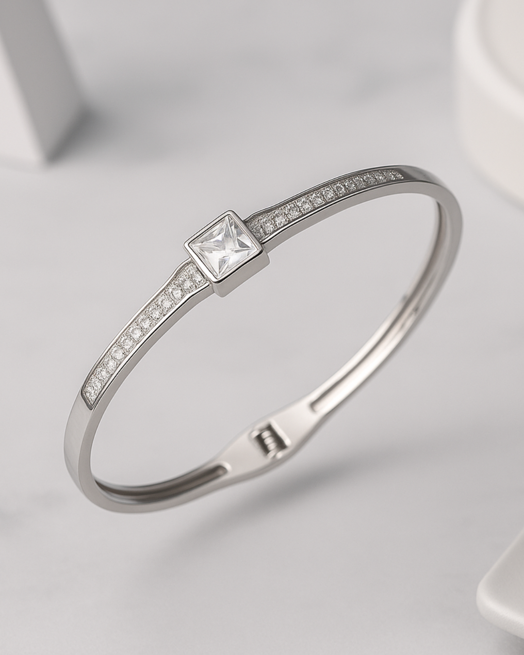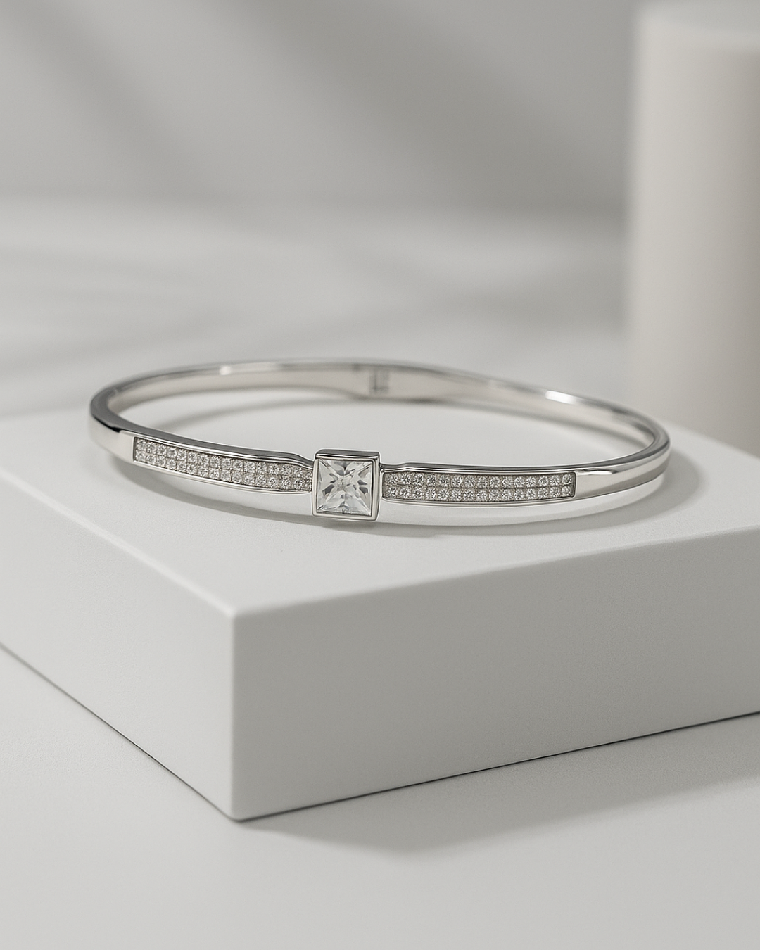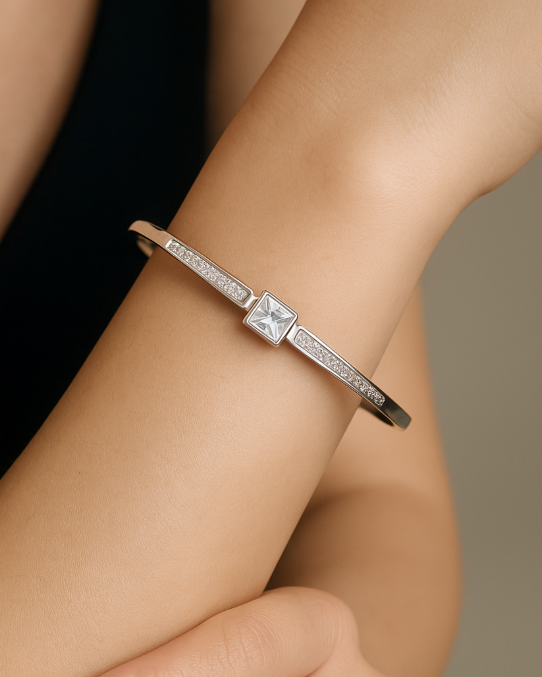 Embrace understated elegance with our Majesty Kada (Bracelet). This sleek sophisticated kada features a princess-cut cubic zirconia stone at its centre, flanked by two graceful rows of pave-set crystals that taper along the silver band. The clean lines and dazzling sparkle of the central stone make this bangle a versatile piece, perfect for everyday wear or for elevating your evening look. Its refined design ensures it will seamlessly complement any style, adding a touch of timless brilliance to your wrist.