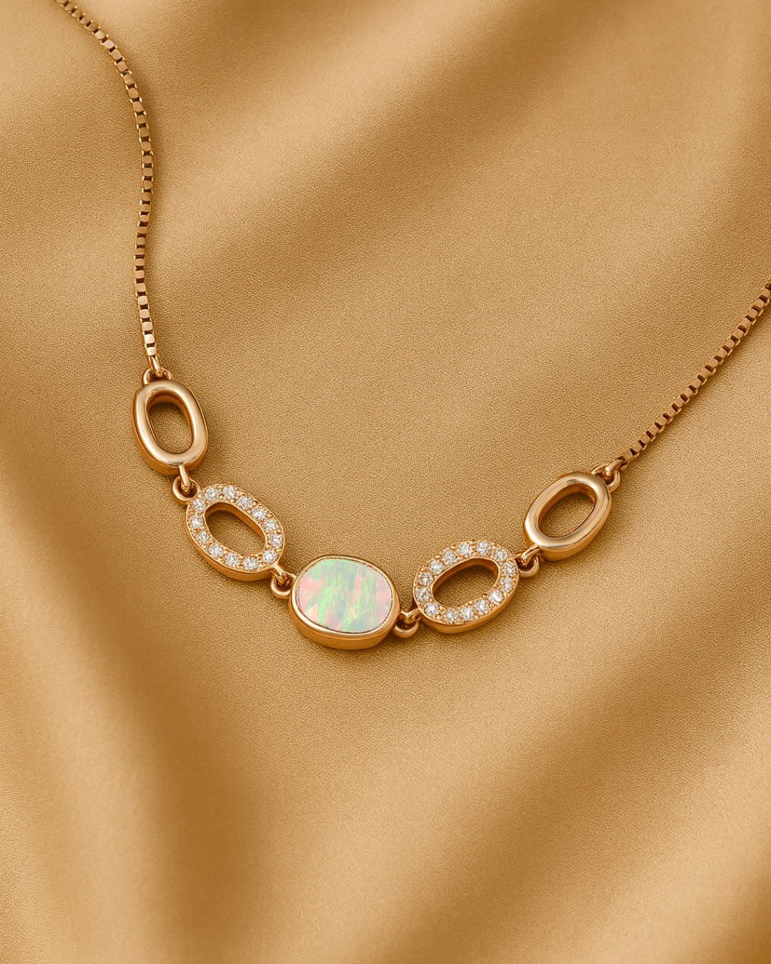 Experience captivating beauty with our Modern Mosaic Bracelet. This rose gold toned piece features a mesmerising oval mother of pearl inlay at its centre, showcasing its vibrant color of play. It is elegantly complemented by alternating polished and pave-set cubic zirconia links which adds to the bracelets sophistication. A modern and enchanting accessory for any occassion.