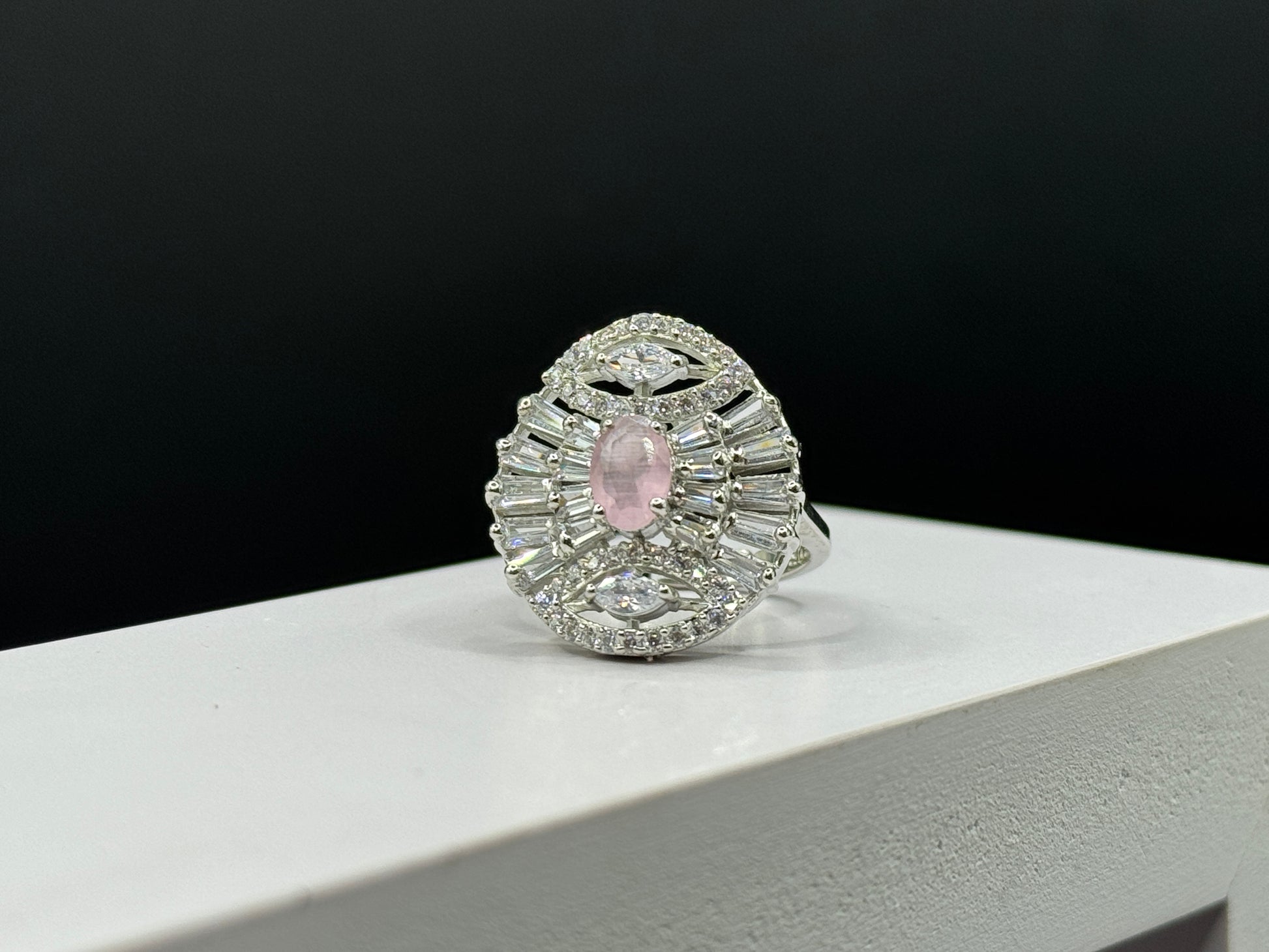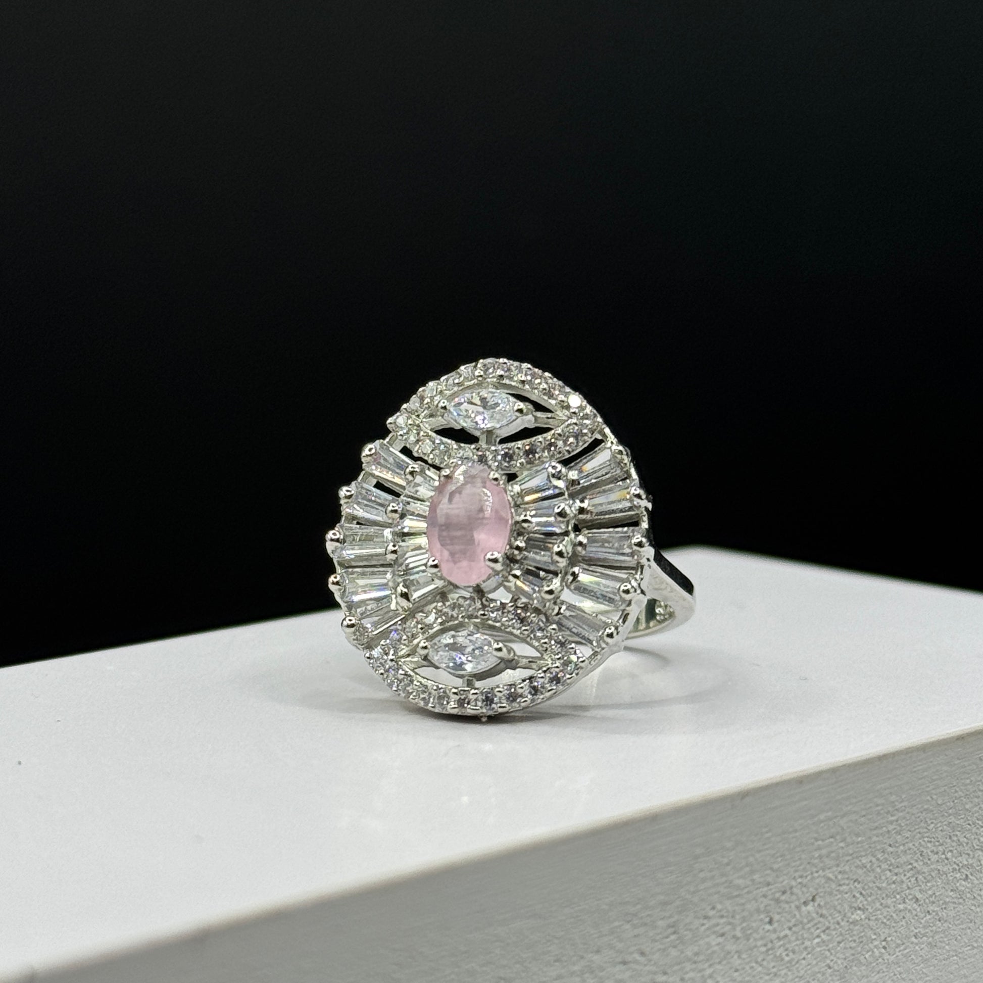 Discover timeless sophistication with this unique statement ring. A delicate, pear-shaped light pink gemstone takes centre stage, encircled by an impressive array of baguette and round cut clear cubic zirconia stones that radiate outwards in a dazzling, fan like design. The intricate detailing and bold presence makes this ring a true showstopper, perfect for adding a touch of vintage glamour to any ensemble.