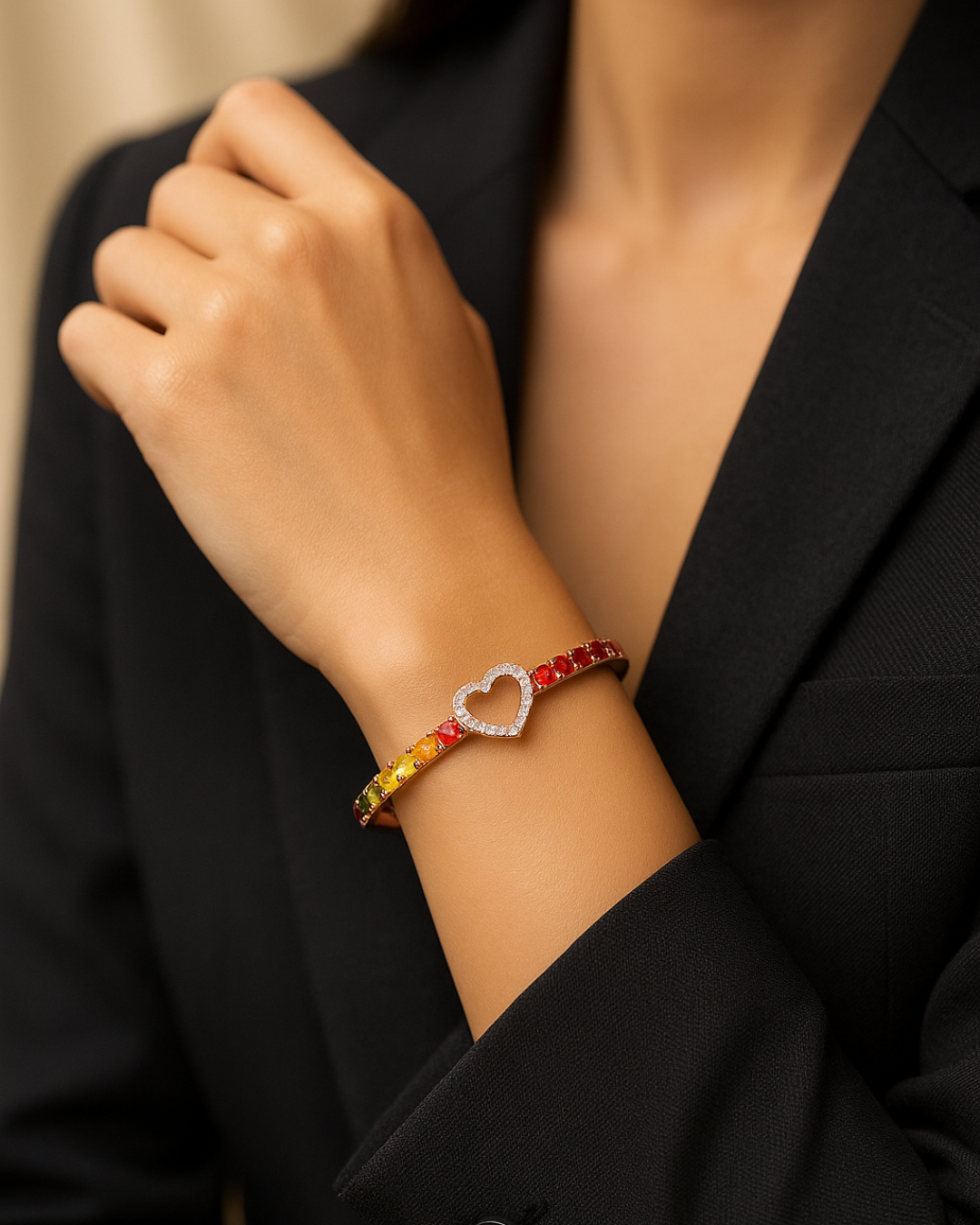 This tennis bracelet is a dance of rainbow stones, anchored by a diamond-kissed heart that speaks of love, color, and elegance.