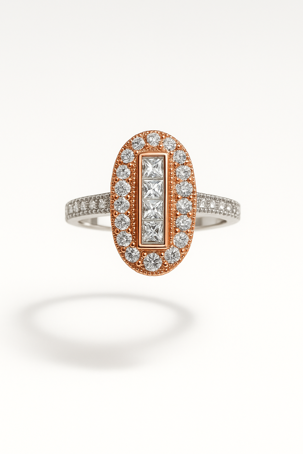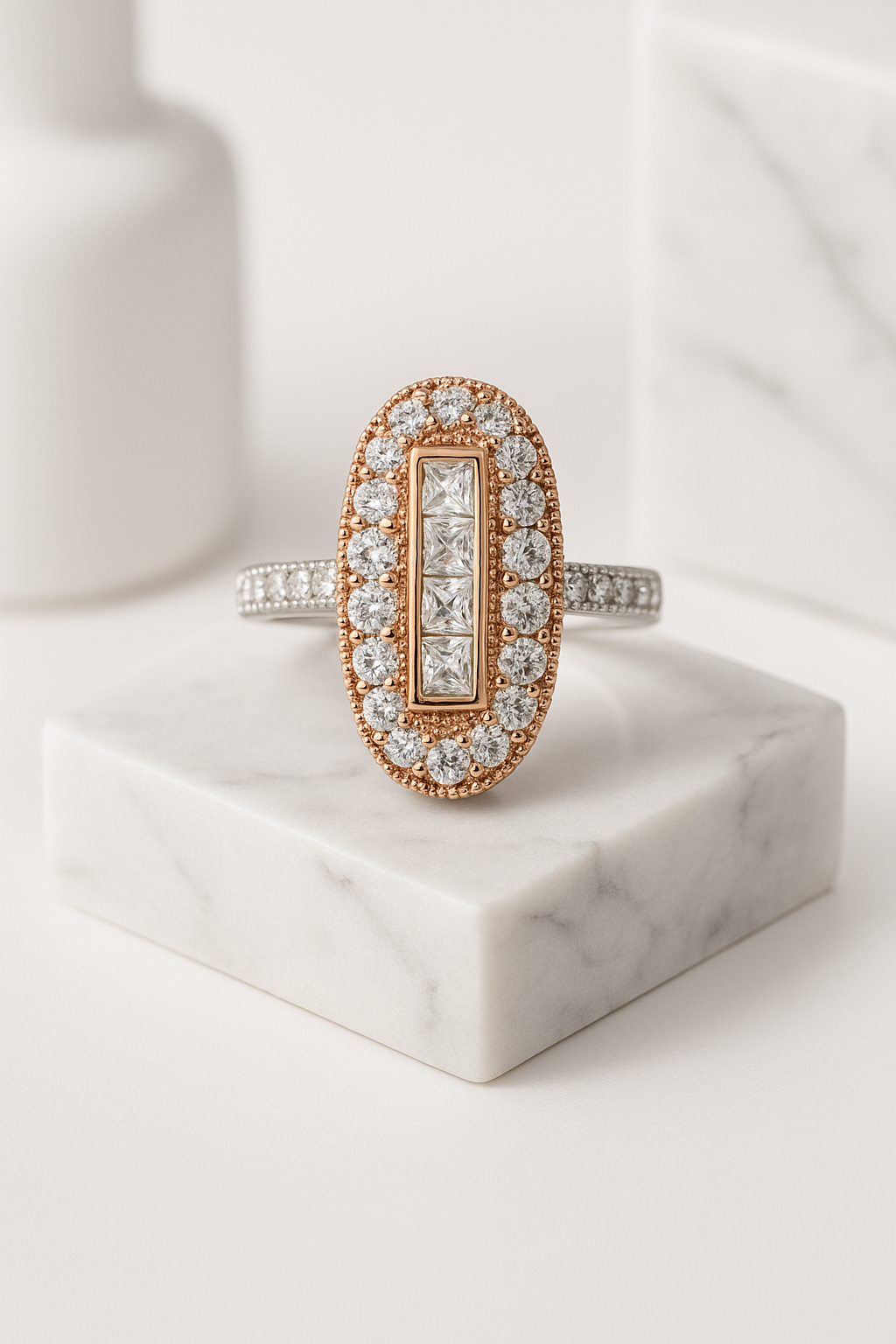A statement of quiet glamour and modern royalty. This oval-halo silhouette pairs precision-cut stones with a warm rose-gold embrace, creating a luminous centrepiece that feels both timeless and bold. Designed for the woman who doesn’t follow trends — she sets them with grace and intention.