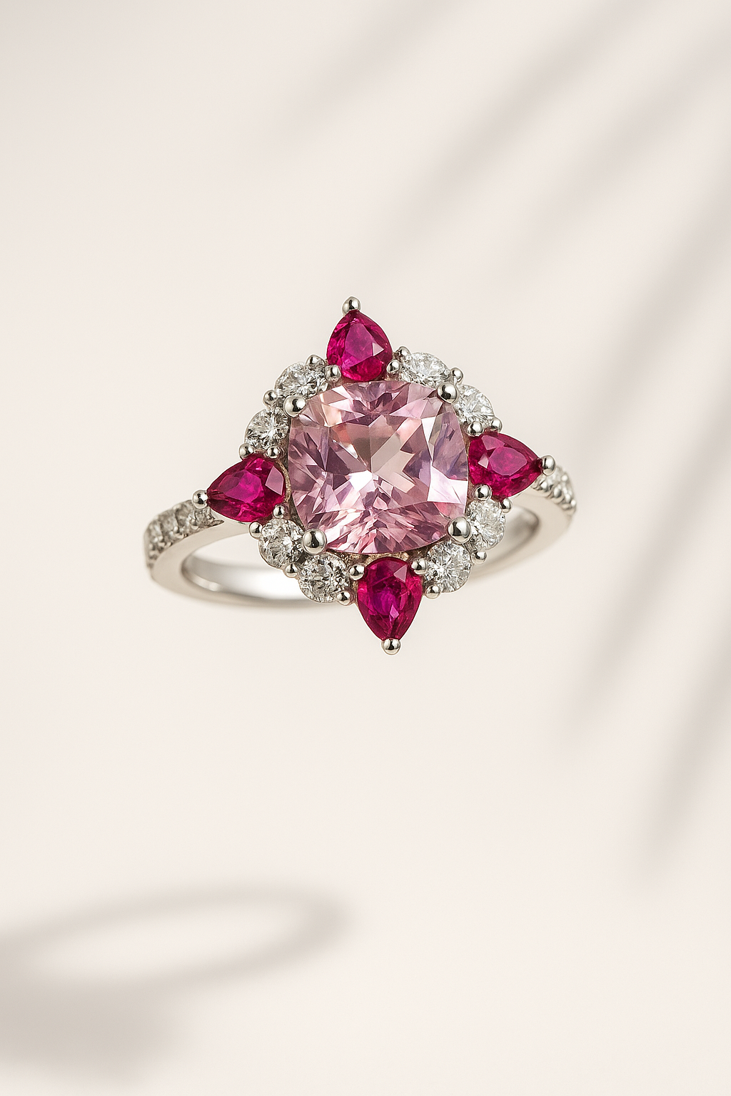 - Stones: Cushion-cut blush zircon centre with marquise-cut ruby pink accents + round zircon halo