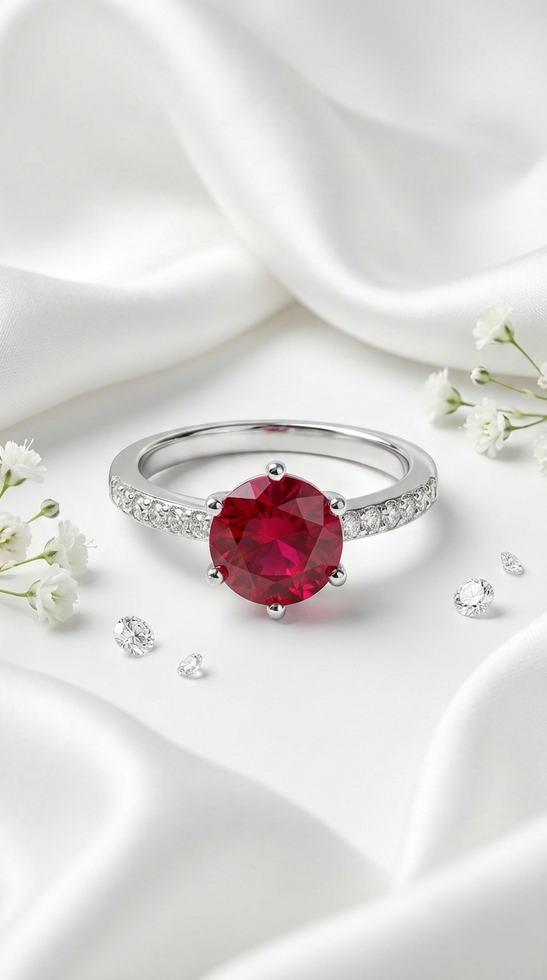 A bold ode to passion and timeless elegance. This radiant ruby-tone solitaire, framed by pavé brilliance, brings a touch of effortless luxury to every moment. Striking yet classic — made to feel personal, powerful, and endlessly romantic.