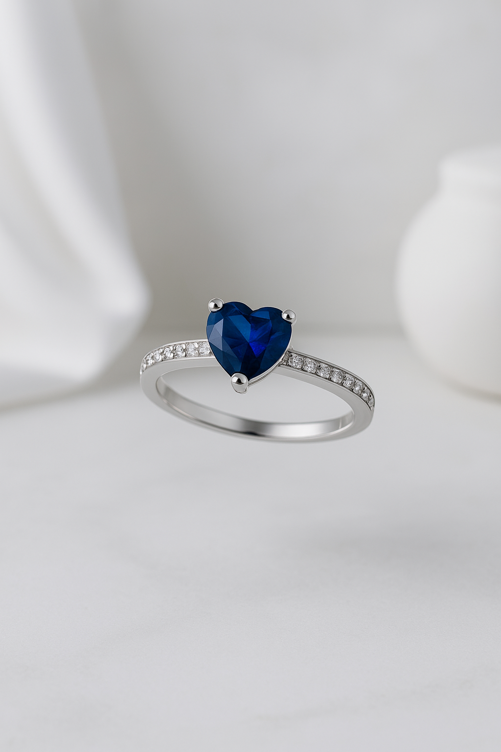 - Stones: Heart-cut deep sapphire zircon centre + pavé white zircon band