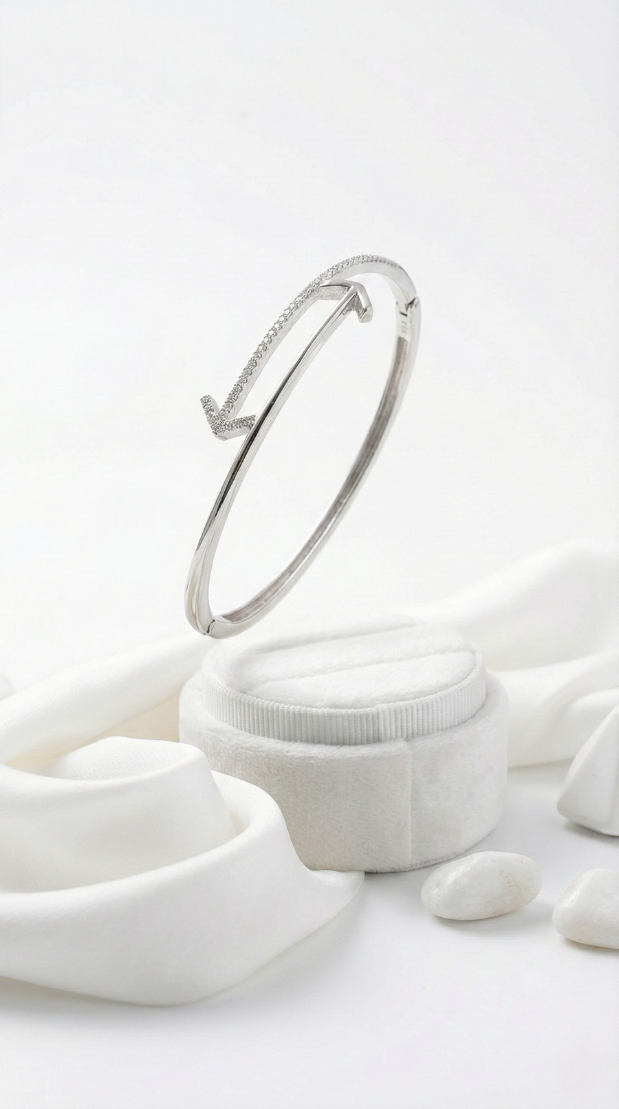A sleek oval-shaped kada crafted in 925 sterling silver, defined by a sharp arrow-inspired silhouette. One arm is accented with fine pavé-set stones, adding a subtle contrast of sparkle against the clean, polished metal.